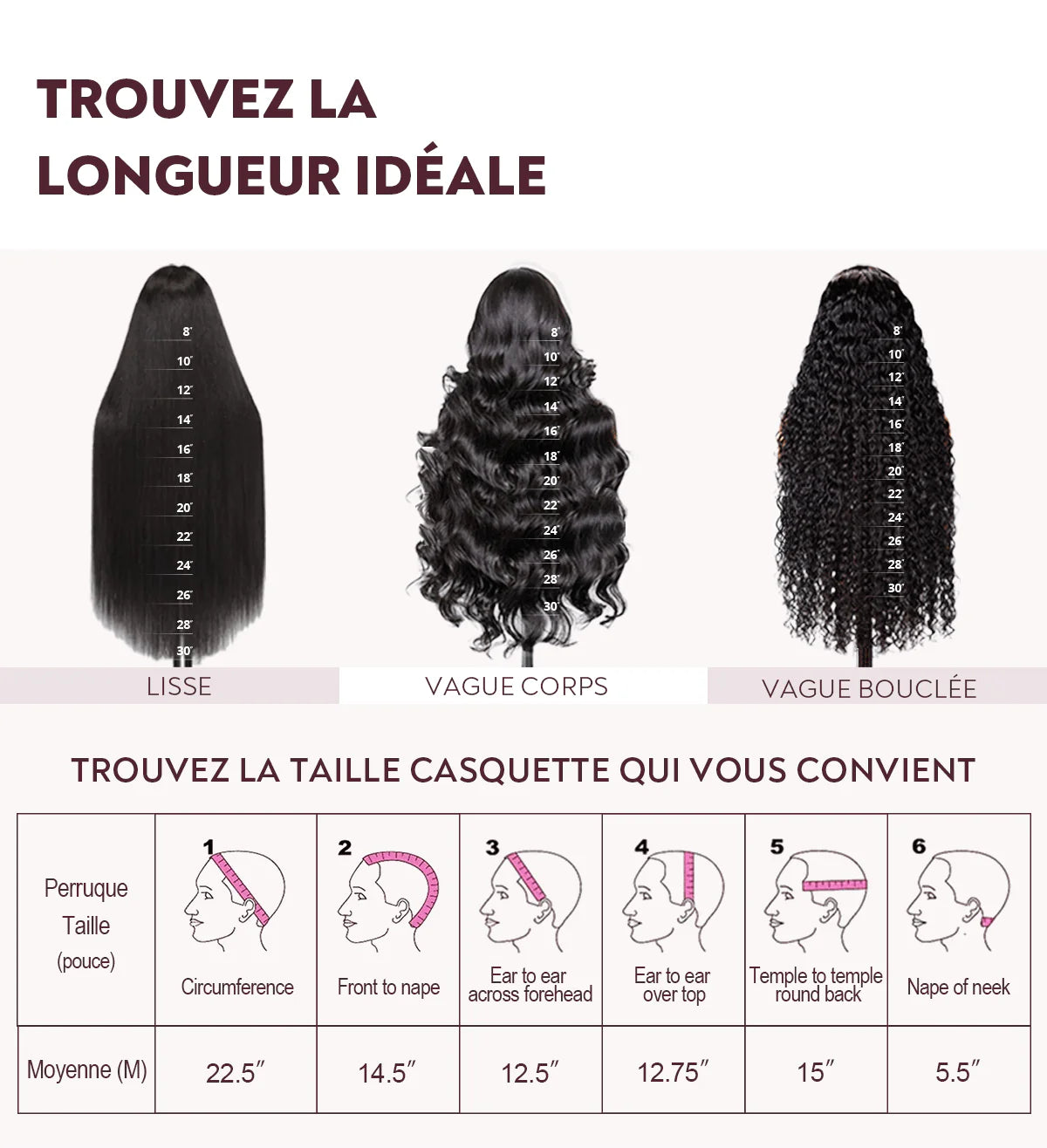 Pour les perruques bouclées et ondulées, vous devez lisser les cheveux avant de les mesurer. Etirez doucement les cheveux jusqu'à leur longueur maximale, puis mesurez du haut de la perruque jusqu'à l'extrémité des cheveux.